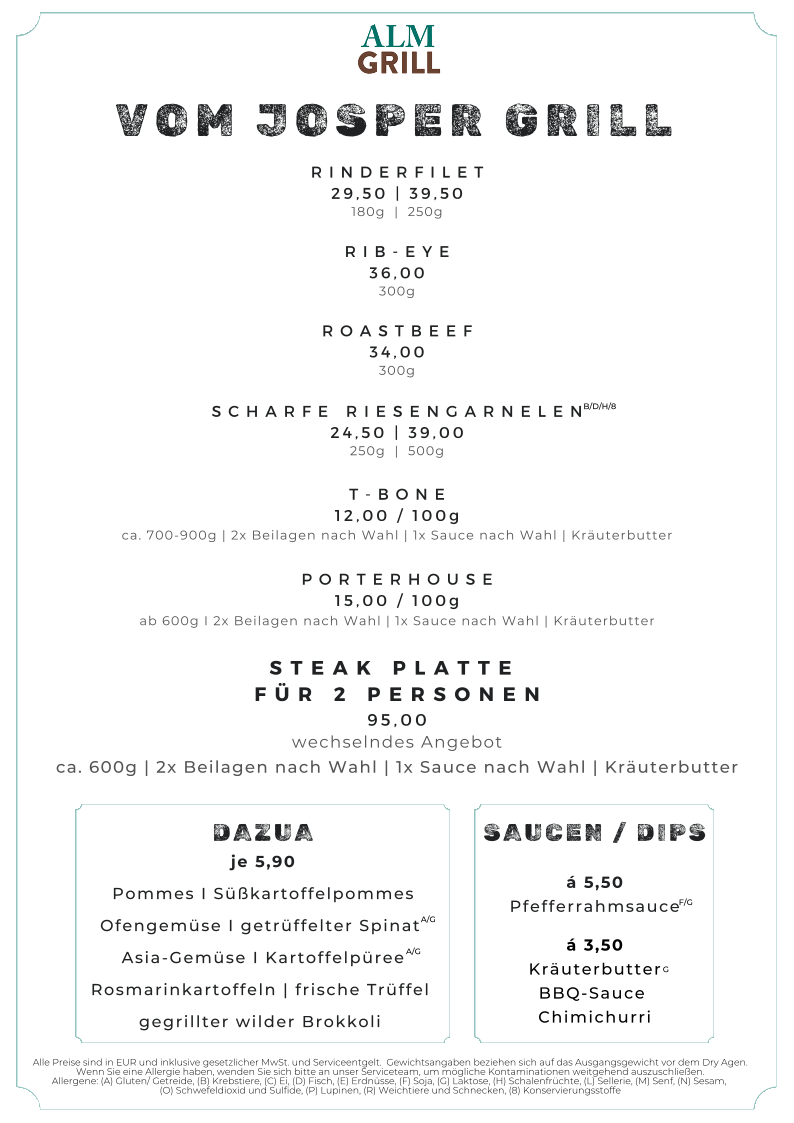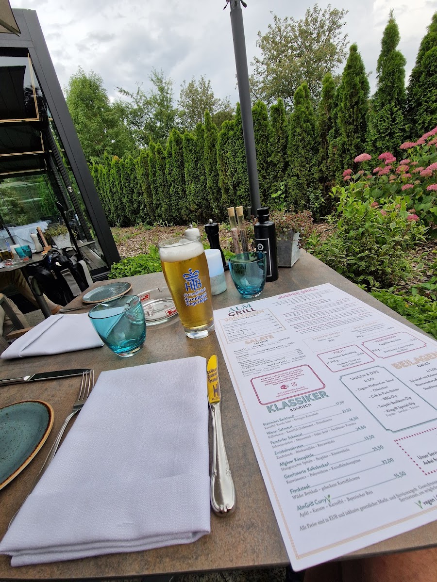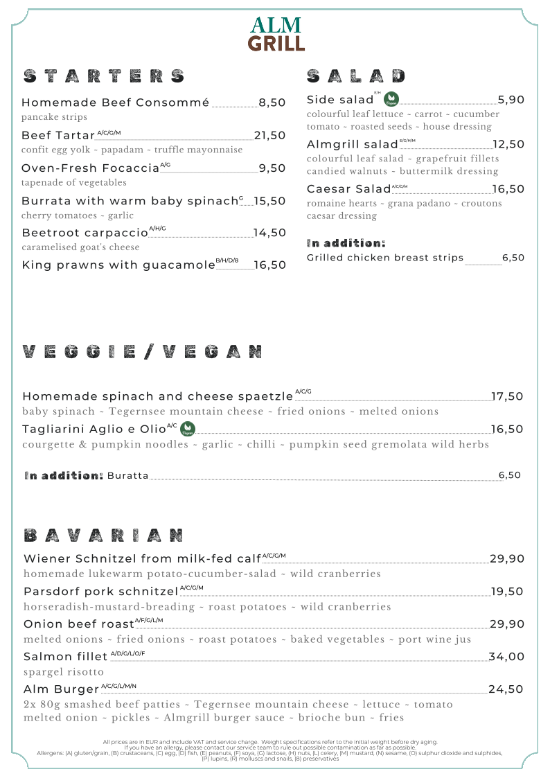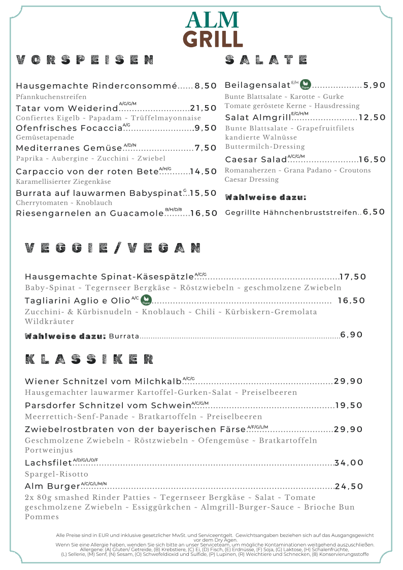 As a concluding impression, the menu at Almgrill Im Hotel Erb in Vaterstetten presents a well-curated balance between Alpine tradition, Bavarian classics, and international grill culture, making it appealing to a wide range of diners. The starters set a refined tone with options such as Homemade Beef Consommé, Beef Tartar, Oven-Fresh Focaccia, and Beetroot Carpaccio, offering both comfort and freshness. Salad lovers are well catered for with the Side Salad, Almgrill Salad, and Caesar Salad, optionally enhanced with Grilled Chicken Breast Strips. Vegetarian and vegan guests are not overlooked, thanks to thoughtfully prepared dishes like Homemade Spinach and Cheese Spaetzle, Tagliarini Aglio e Olio, and the indulgent option of adding Burrata.