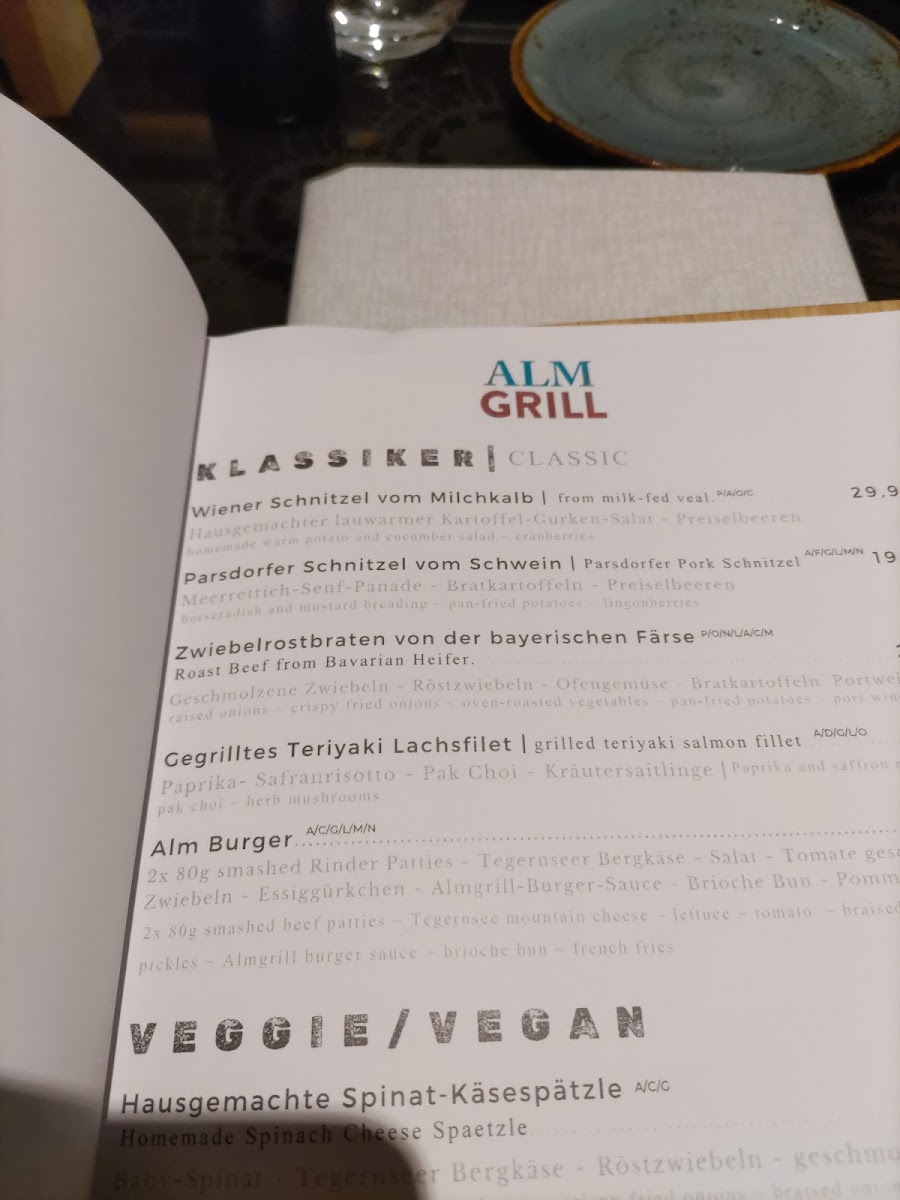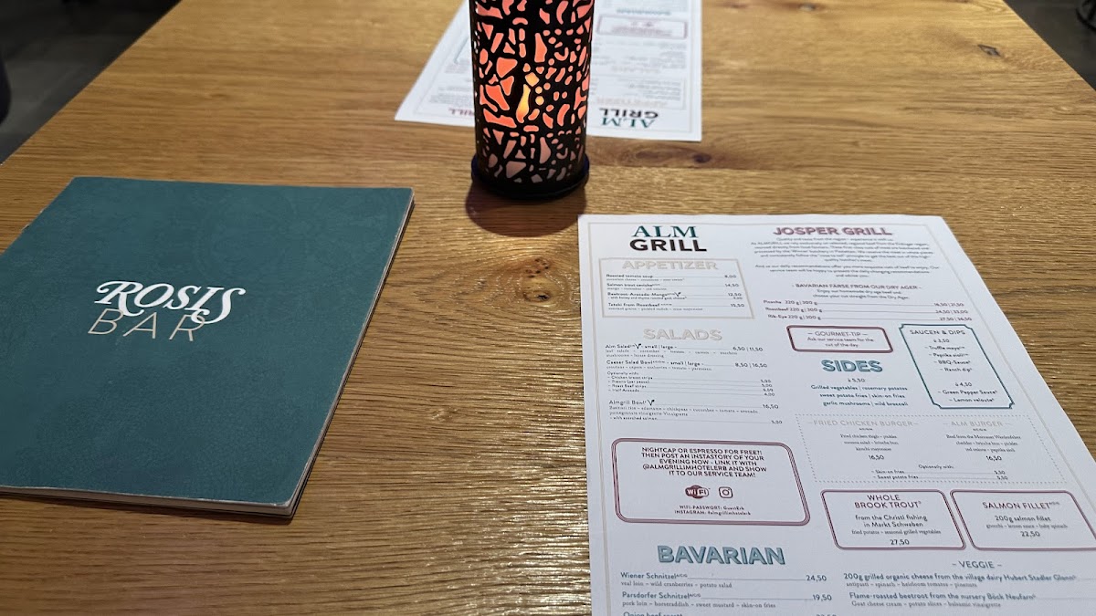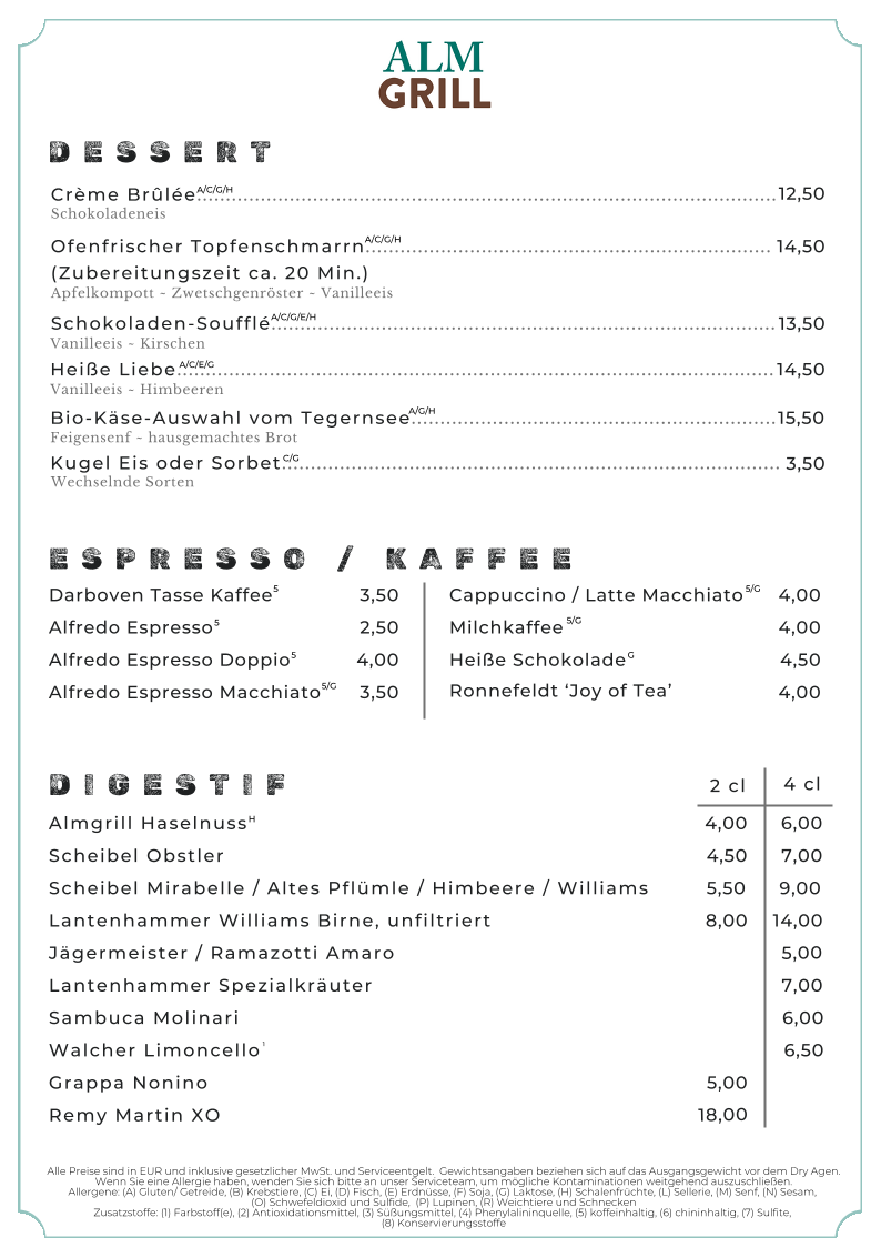 To finish, the dessert selection adds a comforting and indulgent conclusion with Crème Brûlée, Oven-Fresh Topfenschmarrn, Chocolate Soufflé, Hot Love, and a Organic Cheese Selection from Tegernsee. The menu is rounded out with a solid offering of coffee, espresso, and digestifs, including Darboven Cup of Coffee, Alfredo Espresso, and Almgrill Hazelnut or Scheibel Obstler. Overall, the Almgrill Im Hotel Erb menu feels cohesive and generous, successfully summarizing its culinary identity as a place where quality ingredients, regional roots, and grill expertise come together in a satisfying dining experience.
